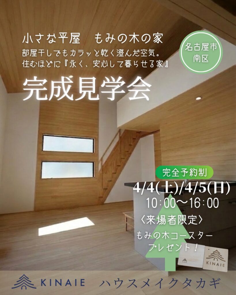 【完成見学会】名古屋市南区「小さな平屋 もみの木の家」開催のお知らせ